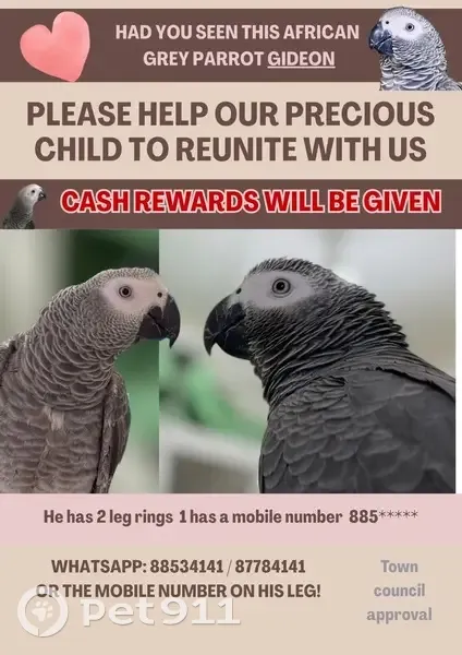 Lost and found pets Singapore, photo: Lost African Grey Parrot in Serangoon