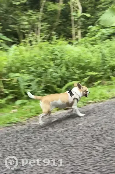 Chihuahua, with a harness, skittish. Running...