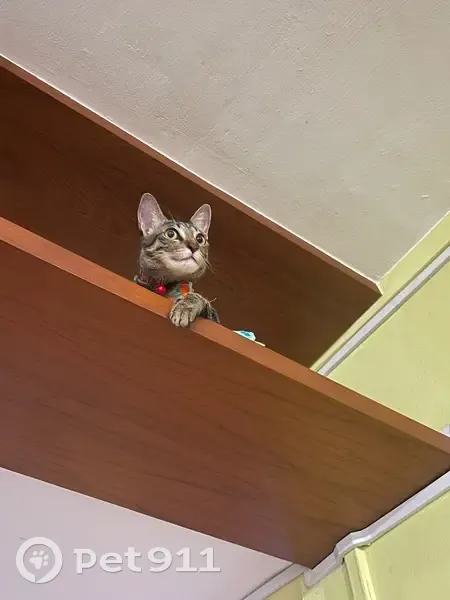-Short-haired brown/black tabby coat with clear striped patterns -Large, round yellow-green eyes that look very alert and expressive -A slim but sturdy build