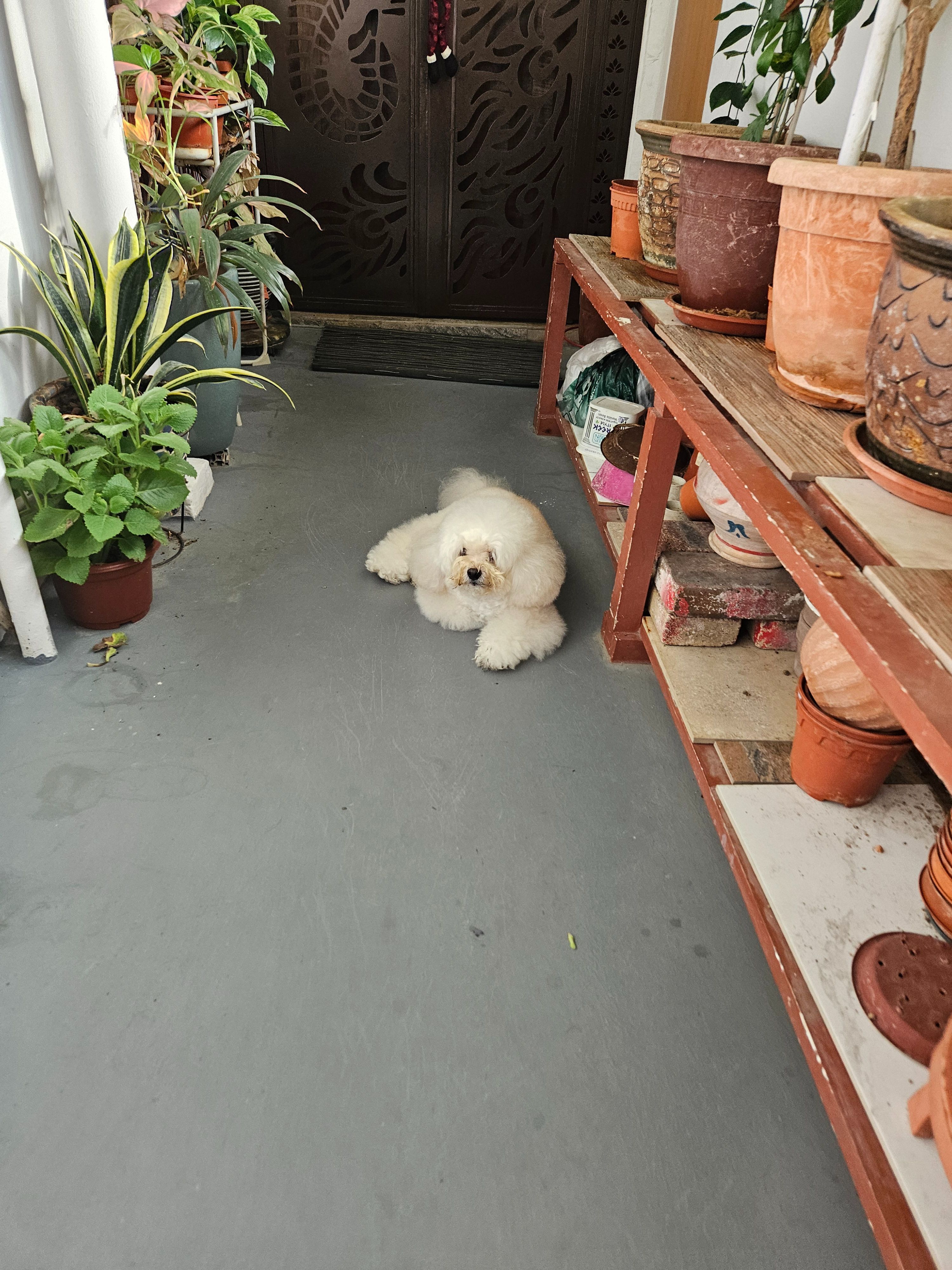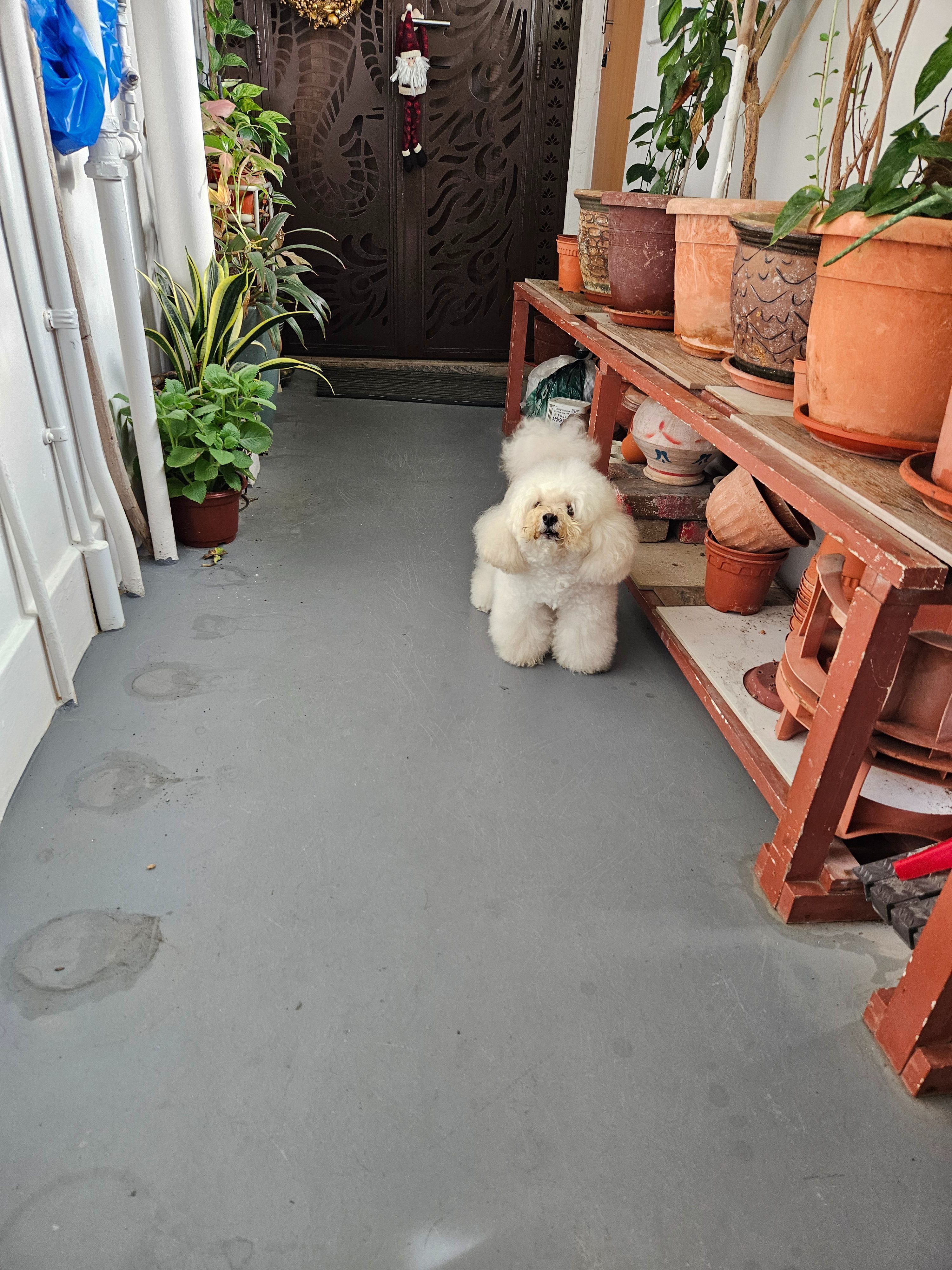 White fluffy dog, with floppy ears. Dog was waving its tail and standing outside my house. But was scared and growled when i tried to leash it. Manage to leash it and one of my neighbours helped to take it around to see if we can find the owner. This was at 9.05am today.