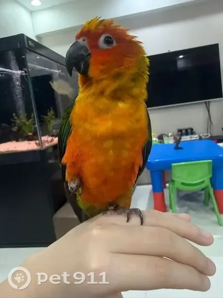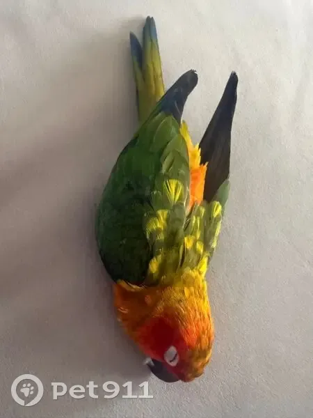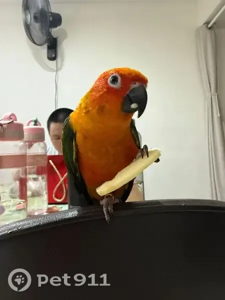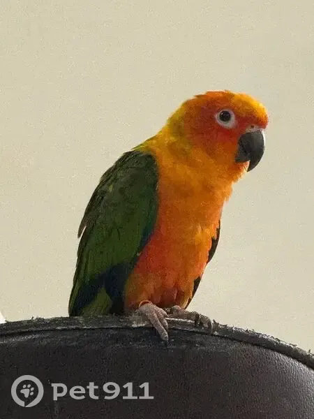 He is a young sun conure (9 months old) with a brownish-orange ring on one of his legs and there is a hint of yellow in his feathers. He was found missing when he accidentally flew out of the window at around 11am.