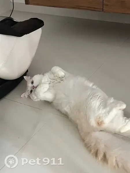 Cammy is gentle-natured but is quite scared of strangers and loud sounds) Not likely to allow strangers to carry him. He has a fluffy white coat with orange tints at the back of his ears and on his tail. Very food motivated so he may be lured by treats. He has a small dented scar on his left cheek right above his whiskers as he recently hurt himself.