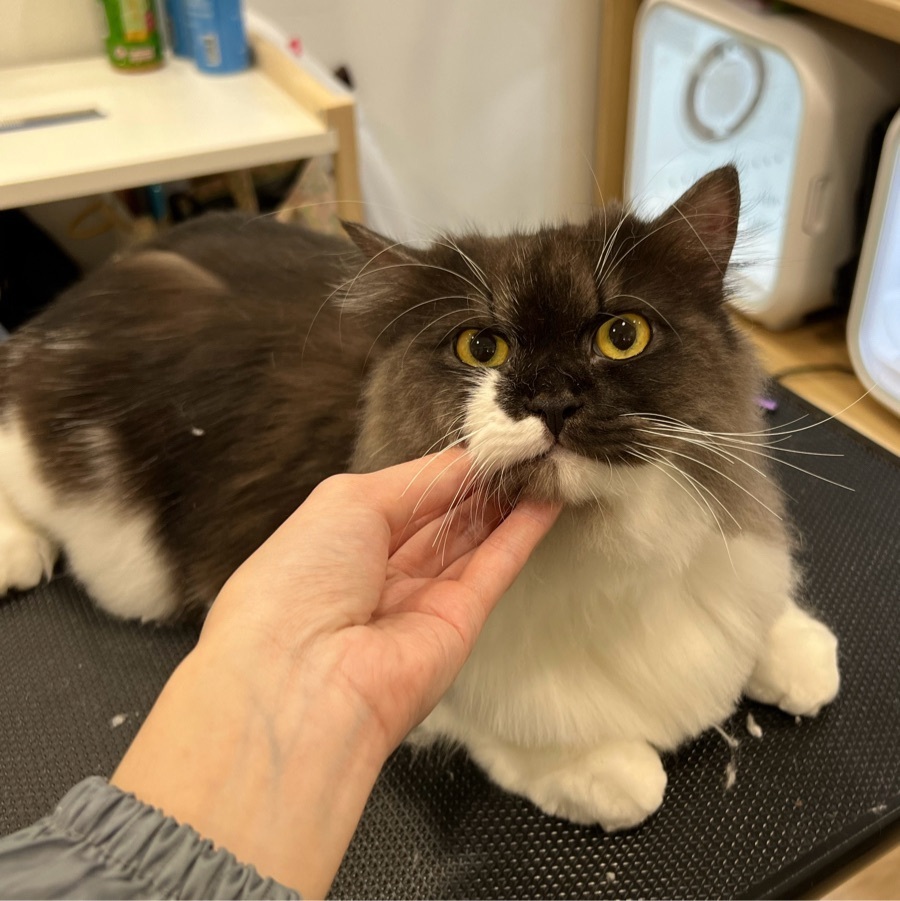 She is white and grey, fur cut in a teddy bear cut. She is wearing a white collar with Disney’s Marie on it.