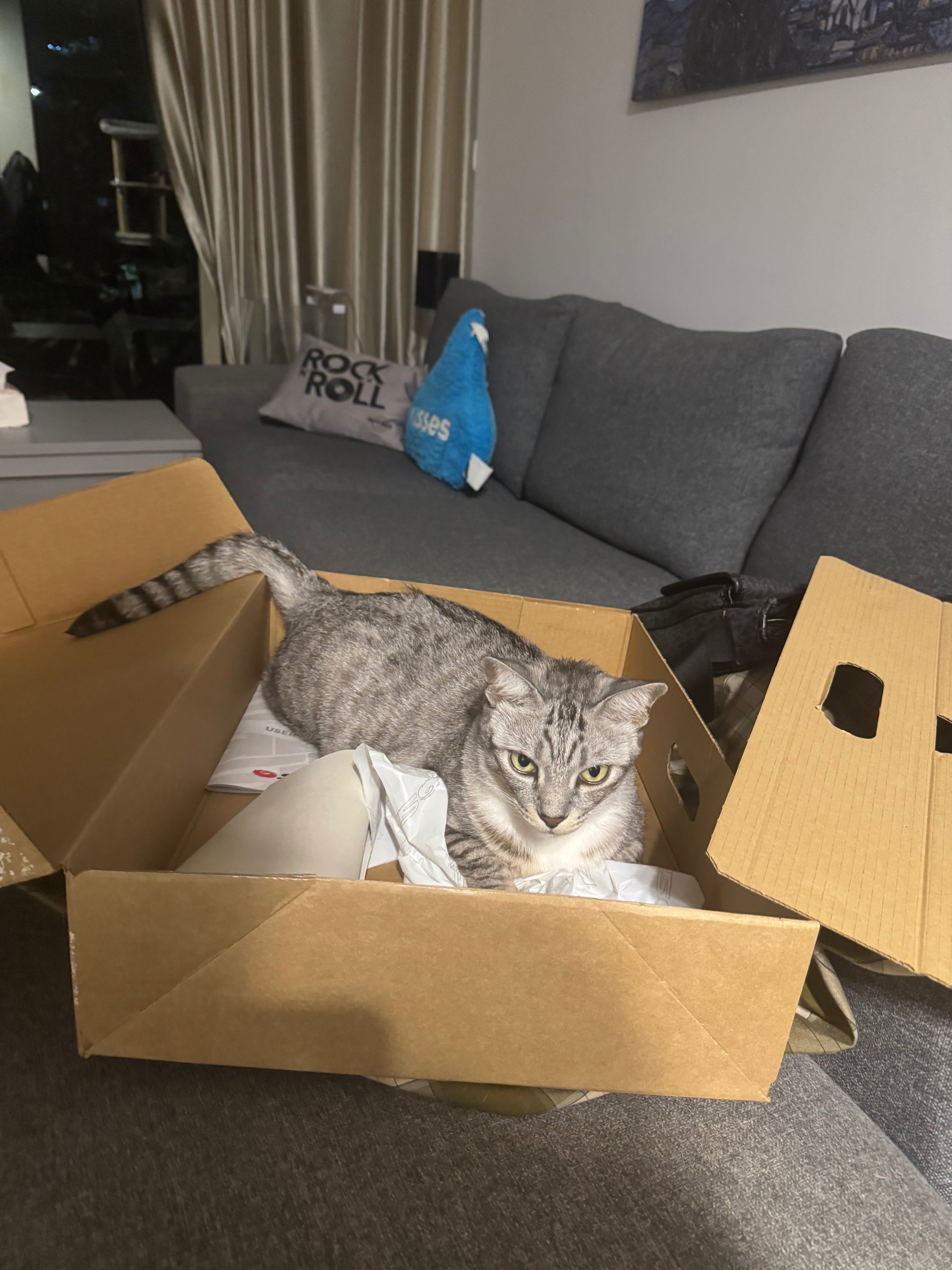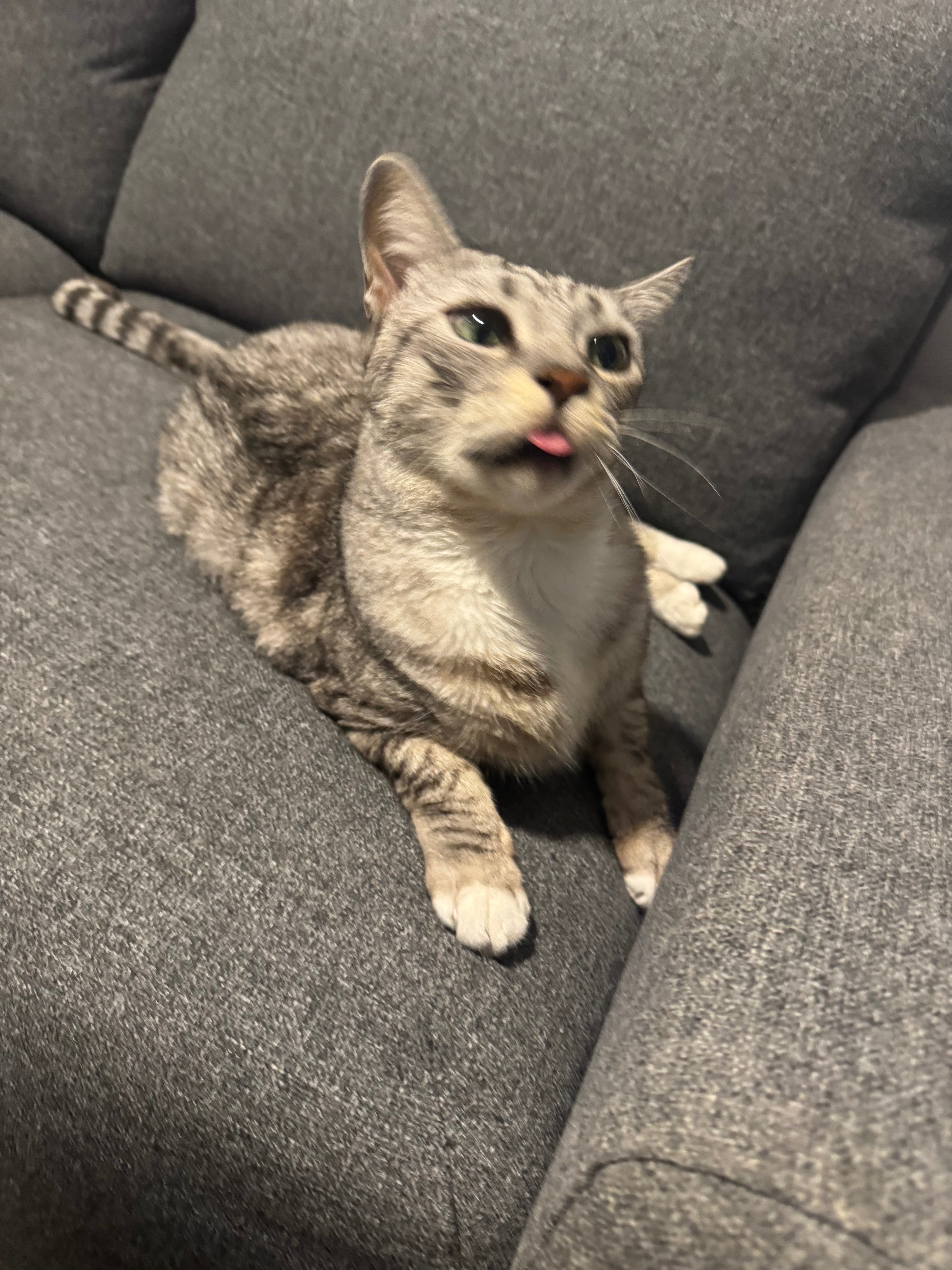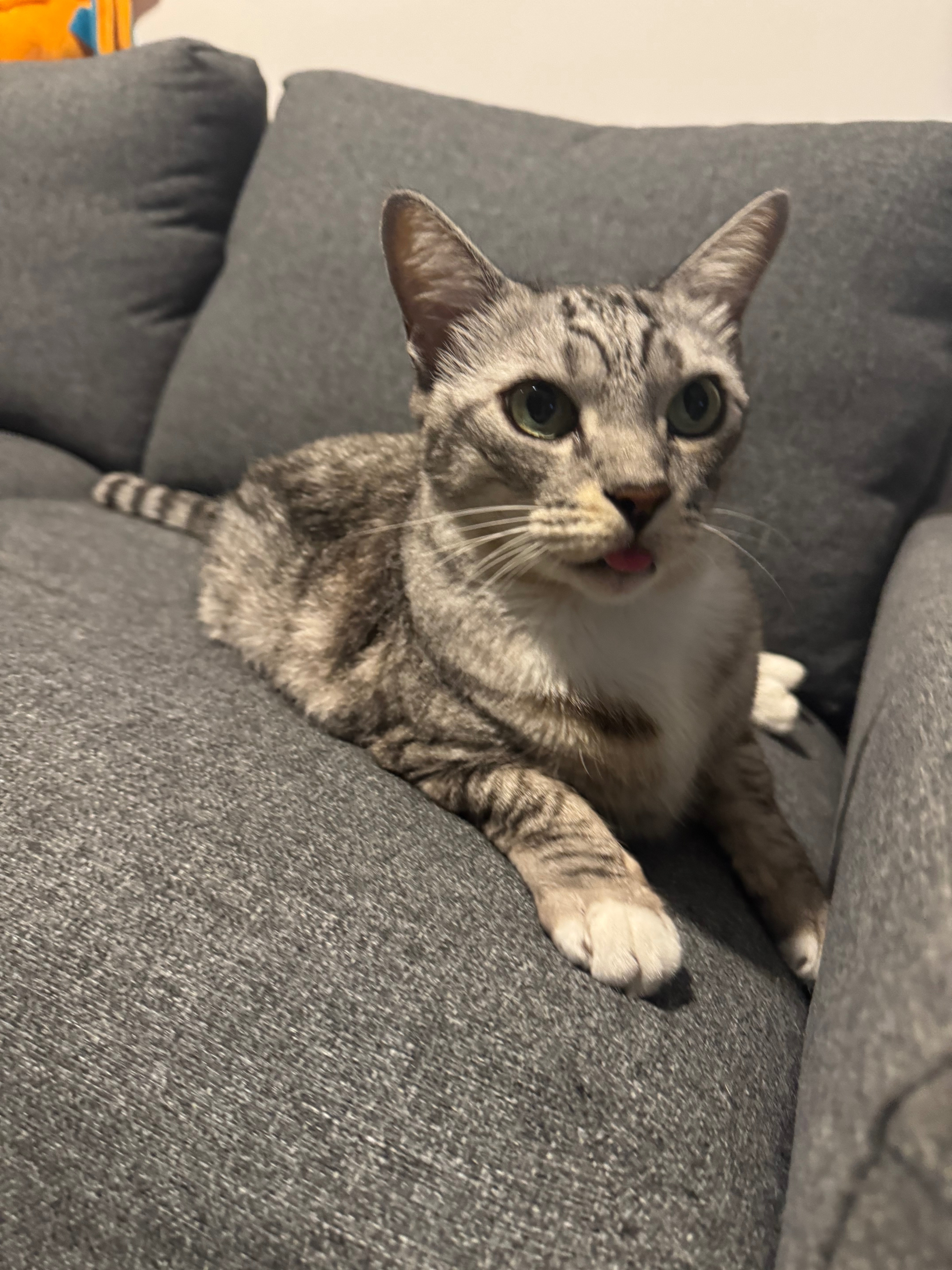 Grey DSH, sterilised and microchipped, friendly with new humans, responds to his name. Not clear how he got lost but he may have squeezed under the gate