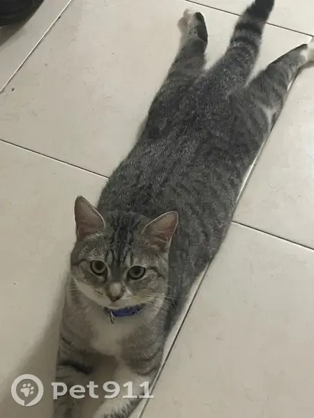 Grey and white fur tabby cat, white underside, she has one pink finger in her pawpad. Friendly but can be quite timid at first. Responds to the name saiki